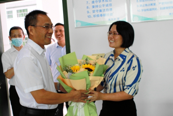 上午第一节课,陈向军来到博学楼的课堂,先后为外国语学院段萍副教授、化学化工学院徐兰英教授送上鲜花与祝福;漆昌柱到创新楼,深入课堂慰问文学院(苏东坡书院)方星移教授、机电与汽车工程学院陈小兰副教授。校领导与4位教师代表亲切交谈,详细了解他们的工作、学习、生活等情况,感谢他们为学校改革发展做出的不懈努力和突出贡献,勉励广大教师不忘立德树人初心,牢记为党育人、为国育才使命,发扬黄师精神,弘扬高尚师德,潜心教书育人,勇攀科研高峰,积极服务社会,真抓实干挑重担,攻坚克难启新程,在推动学校高质量发展中再建新功。